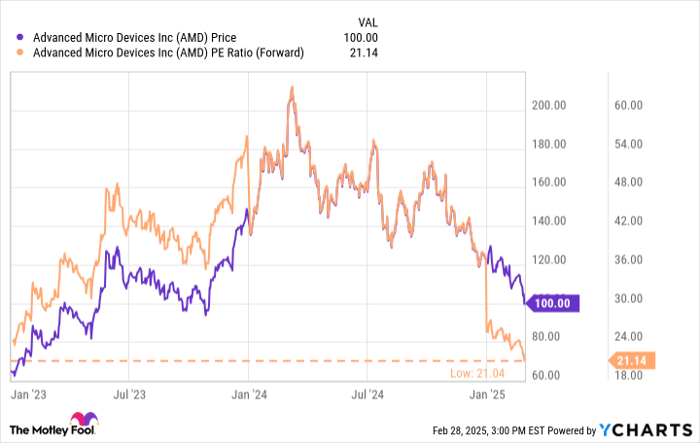 As the graph above illustrates, AMD’s share price of roughly $100 is its lowest point in about a year. Moreover, the company’s forward price-to-earnings (P/E) ratio of 21.1 represents a two-year low.