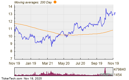 In trading on Wednesday, bargain hunters could buy shares of Ford Motor Co. (Symbol: F) and achieve a cost basis 3.3% cheaper than Thornton, with shares changing hands as low as $12.76 per share. Ford Motor Co. shares are currently trading up about 1.1% on the day. The chart below shows the one year performance of F shares, versus its 200 day moving average:
