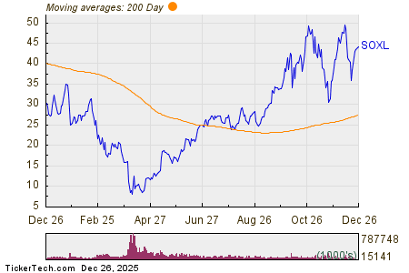 The chart below shows the one year price performance of SOXL, versus its 200 day moving average: