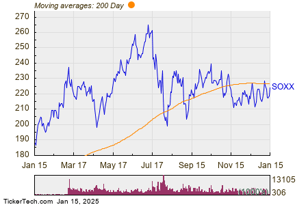 Looking at the chart above, SOXX’s low point in its 52 week range is $183.5367 per share, with $267.24 as the 52 week high point — that compares with a last trade of $224.35. Comparing the most recent share price to the 200 day moving average can also be a useful technical analysis technique — learn more about the 200 day moving average ».