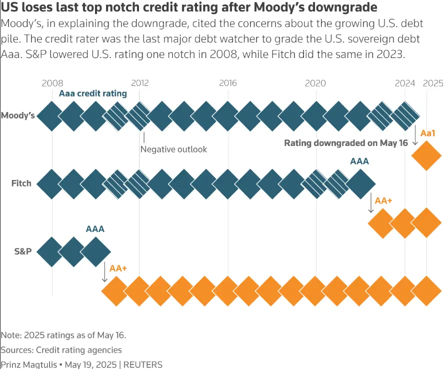 On Friday, Moody’s Investors Service downgraded the U.S. credit rating, adding to worries about the country’s growing debt.Moody Credit Rating