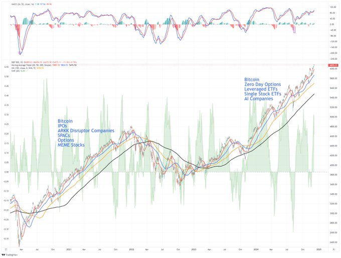 Stocks, , leveraged investments, and meme stocks are all surging higher, which is certainly reminiscent of the “madness” we witnessed following the Covid lockdowns. I posted the following chart on “X” Friday morning for reference.