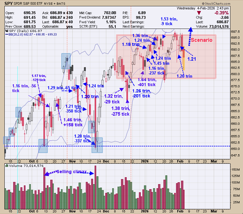 The second window up from the bottom is the weekly /TLT ratio and next higher window is the weekly SPX. The weekly SPX/VIX ratio has been trending down since late December and the SPX, more or less has gone sideways, which is divergence. This sideways action can last a while before the market may react. The trin closes have been showing panic suggesting a short term low is near (page 1) and another rally short term is possible. If the SPX manages a new high and the weekly SPX/VIX ratio fails to reach a new high a large divergence would develop on the SPX similar to the one in December to February of 2025. Staying long the SPX for now.”