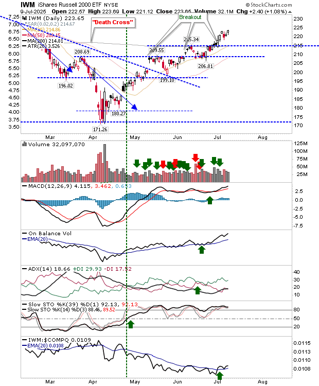 Likewise, the is in a similar bullish mode with two days of accumulation under its belt. There is no cause of concern for bulls and little on offer for shorts.