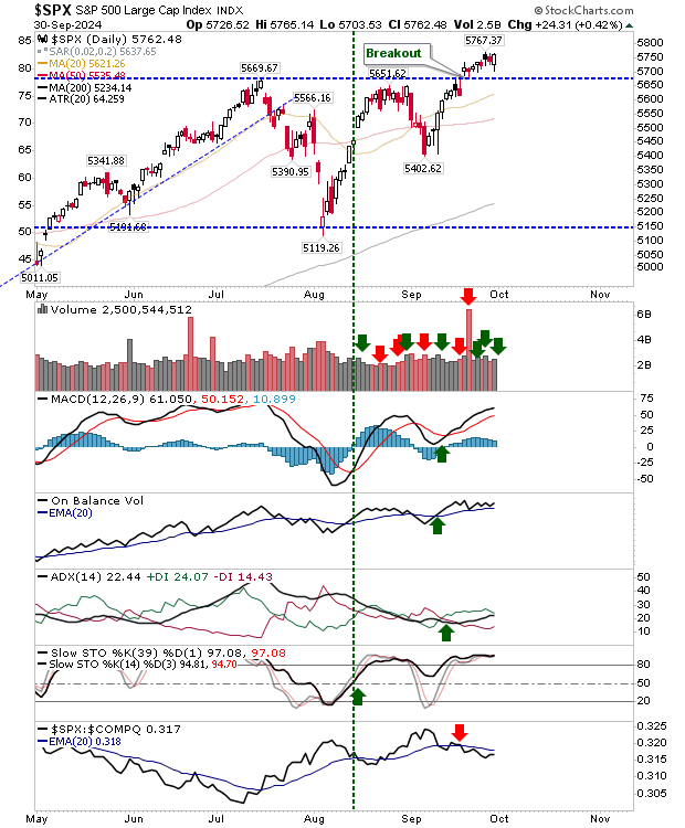Small Caps are typically the frontrunners in market movements, but currently, the S&P 500 is taking the lead. In recent activity, the index has been edging towards testing breakout support without fully committing.