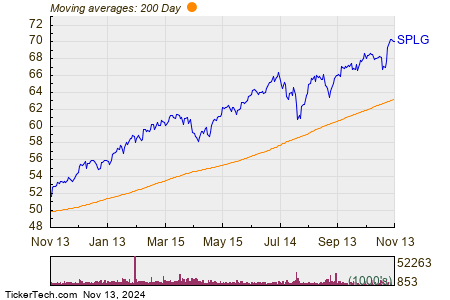 Looking at the chart above, SPLG’s low point in its 52 week range is $52.46 per share, with $70.59 as the 52 week high point — that compares with a last trade of $70.16. Comparing the most recent share price to the 200 day moving average can also be a useful technical analysis technique — learn more about the 200 day moving average ».