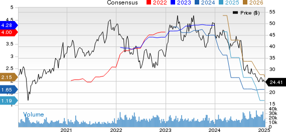 STM projects midpoint revenues for the fourth quarter of 2024 to be $3.32 billion, indicating a 22.4% year-over-year decrease. The Zacks Consensus Estimate for the top line is also pegged at $3.32 billion. At the midpoint, the gross margin is anticipated to be roughly 38%, impacted negatively by about 400 basis points, mainly due to the product mix, sales price and higher unused capacity charges. The consensus mark for earnings is pegged at 35 cents per share, down 18.6% in the past 30 days. This indicates a year-over-year decline of 69.3%.