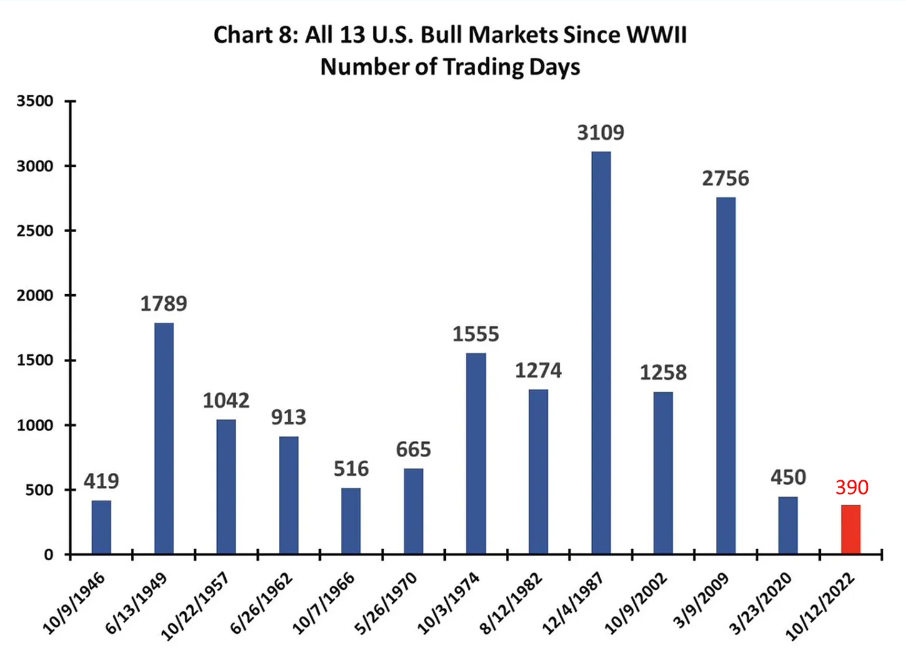 If the current bull market were to end today, it would be the shortest since the postwar period, ranking fourth last out of 13 bull markets in terms of total return since its inception (40.7%).