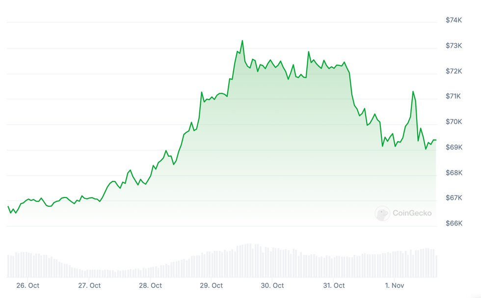 The rally continued Tuesday (October 29), pushing Bitcoin past the elusive US$70,000 it had been stuck beneath for weeks to US$71,540. By Wednesday (October 30) it was near its all-time high, hitting US$73,295. This triggered some liquidations, but strong exchange-traded fund inflows suggested continued demand.
