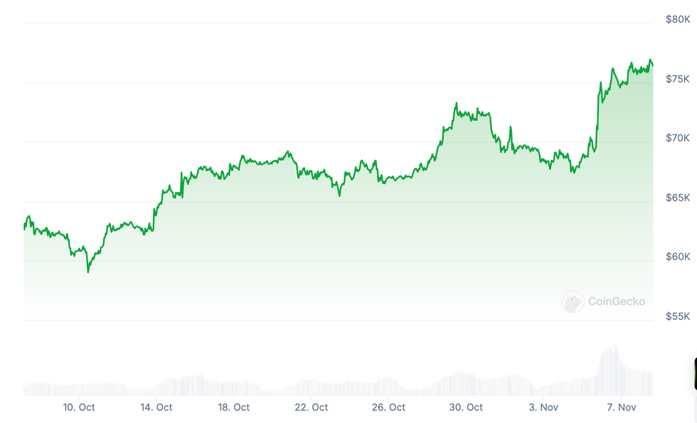 On November 6 at 5:35 AM EST, after Trump declared victory, Bitcoin was trading at around US$73,000. The price continued to rise as the markets opened on Wednesday, briefly breaking past US$76,000 before retreating slightly as Western markets closed. It traded in the US$74,000 range in Asia and retook US$76,000 at around 11:00 AM EST.