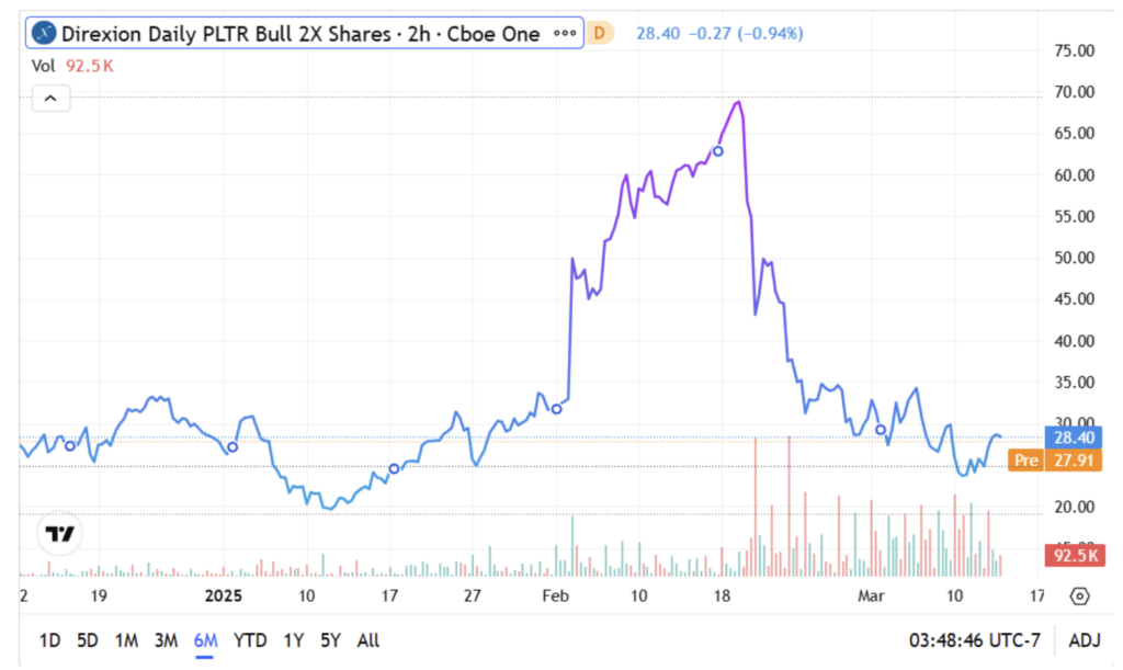 The PLTD ETF: Also making its debut in December 2024, the Direxion PLTR bear fund is down almost 26% despite not being in the market for that long.