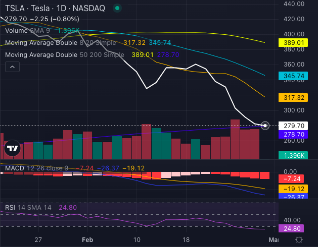 TSLA stock, at $279.70, is trading below its five-day, 20-day and 50-day exponential moving averages, signaling strong bearish momentum and persistent selling pressure. The eight-day simple moving average (SMA) sits at $317.32, while the 20-day SMA is at $345.74—both indicating further downside risk.
