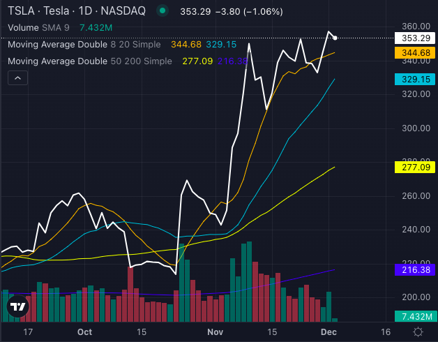 From a technical standpoint, TSLA stock is in clear bullish territory, with the stock price comfortably above its five-, 20- and 50-day EMA (exponential moving averages). The current trend points to continued upside, with key indicators such as the eight-day SMA (simple moving average) ($344.68), 20-day SMA ($329.15) and 50-day SMA ($277.09) signaling strong momentum.