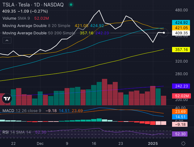 The MACD (moving average convergence/divergence) indicator at 14.51 and an RSI (relative strength index) of 52.30 suggest TSLA stock still has room for upward movement, though recent bearish signals from shorter-term averages may raise caution.