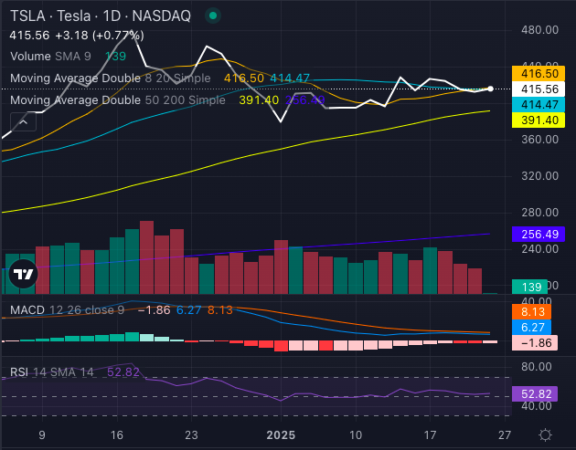 The RSI (relative strength index) sits at a neutral 52.82, and the MACD (moving average convergence/divergence) of 6.27 leans bullish, indicating Tesla still has some gas left in the tank.