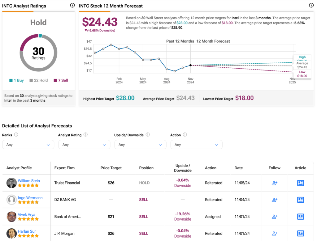 Turning to Wall Street, analysts have a Hold consensus rating on INTC stock based on one Buy, 22 Holds, and seven Sells assigned in the past three months, as indicated by the graphic below. After a 29.86% loss in its share price over the past year, the average INTC price target of $24.43 per share implies 5.68% downside risk.