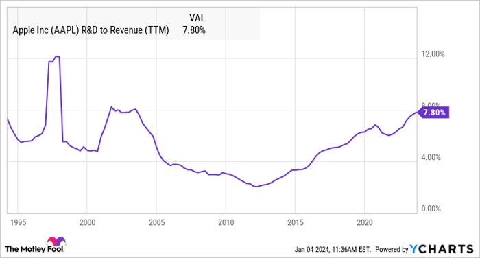 Nevertheless, there’s a brewing storm in Cupertino, California. Apple allocated a staggering 7.8% of its total sales last year to research and development (R&D) expenses, equating to nearly $30 billion. This figure represents the highest proportion of revenue the tech behemoth has spent on R&D in two decades – a time when it was expanding its iPod and music business and conceptualizing the first iPhone.