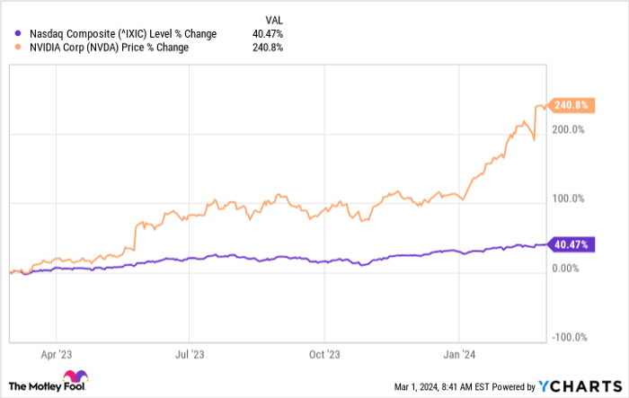 In the story of the Nasdaq’s triumphant rise to a new high in February, Nvidia emerges as a central character. This artificial intelligence (AI) chip powerhouse has seen a remarkable surge, outperforming the index by leaps and bounds. Its weighty presence in the Nasdaq, coupled with a staggering 240% surge in stock value over the past year, has undoubtedly fueled the index’s success.