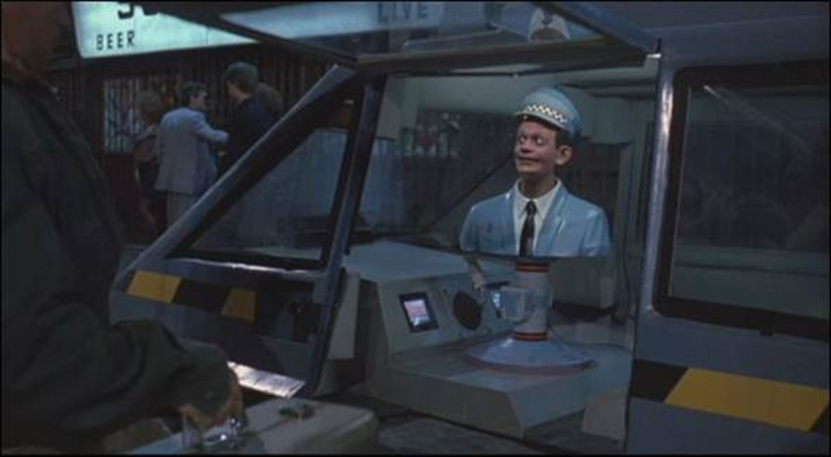 This cab had a creepy little robot sitting in the front seat, cracking jokes while it drove Arnold through a futuristic city. No steering wheel. No driver. Just a talking machine on wheels.