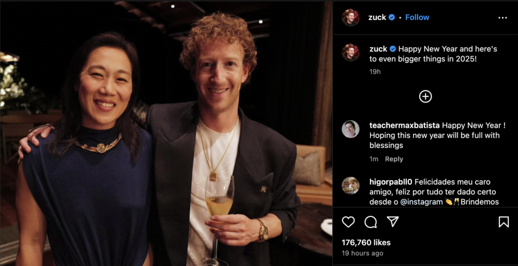 Meta Platforms Inc. META CEO Mark Zuckerberg took to Instagram, posting a photo with his wife, Priscilla Chan, and toasting to “even bigger things in 2025.”