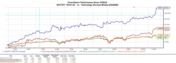 Moving toward a full year of probability, Spotify’s Q3 EPS soared 341% to $1.59 compared to $0.36 a share in the comparative quarter. However, this missed the Zacks EPS Consensus of $1.75 although Q3 sales of $4.38 billion exceeded estimates of $4.36 billion. Year over year, Q3 sales increased 20% from $3.65 billion in the prior period.