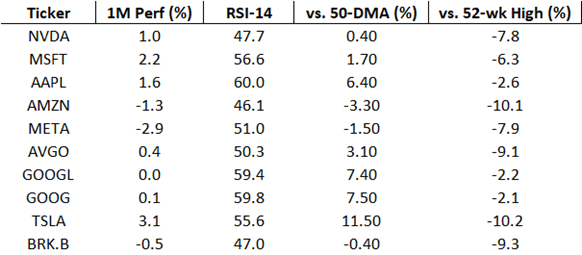 The market’s heavyweights have been throwing punches all year, but lately they look like they’re catching their breath between rounds. The top 10 stocks – now representing nearly 38% of the index’s total weight – are still in the fight, yet their pace has clearly slowed. The long-term uptrends remain intact, but short-term momentum has softened, and traders are seeing more intraday swings and fading rallies.