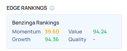 • Edge Stock Ratings: 39.60 Momentum score with Value at 94.24.
