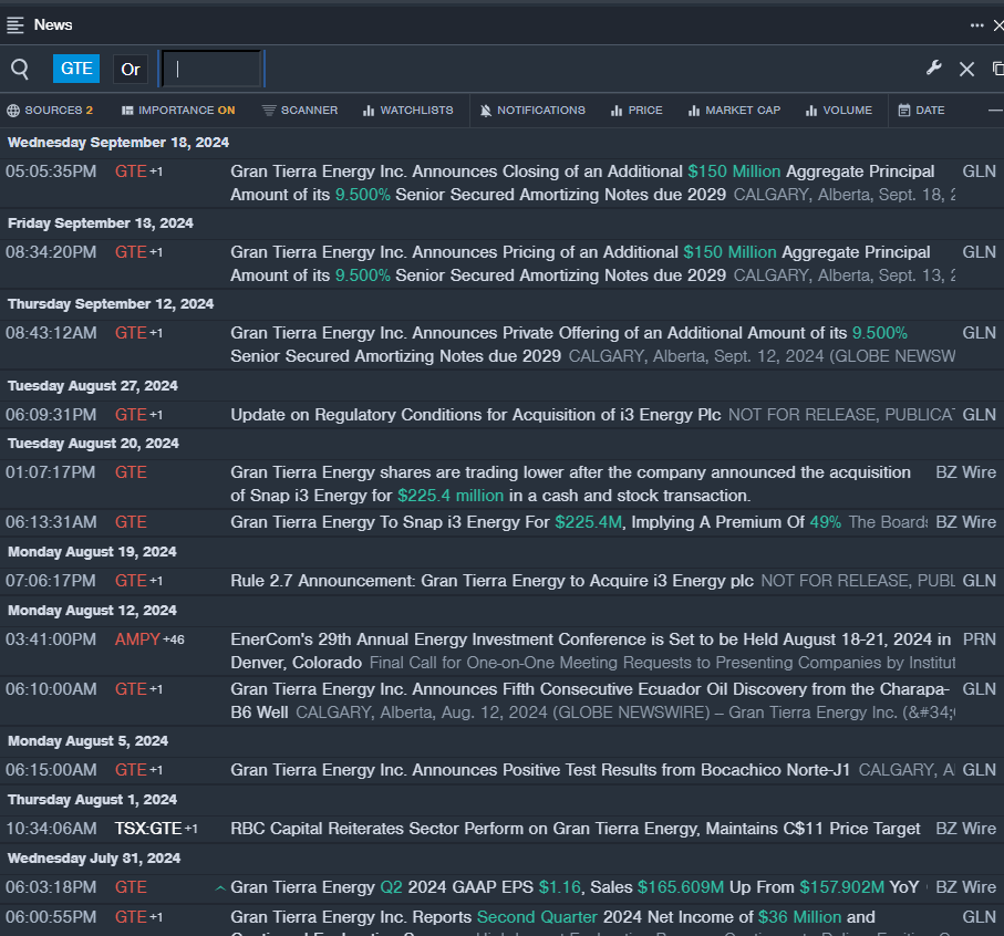 - Recently, Gran Tierra Energy Inc announced the successful closure of an additional $150 million in senior secured amortizing notes due 2029. Despite this positive development, the company’s stock has decreased by approximately 31% in the past month and hit a 52-week low of $4.72.