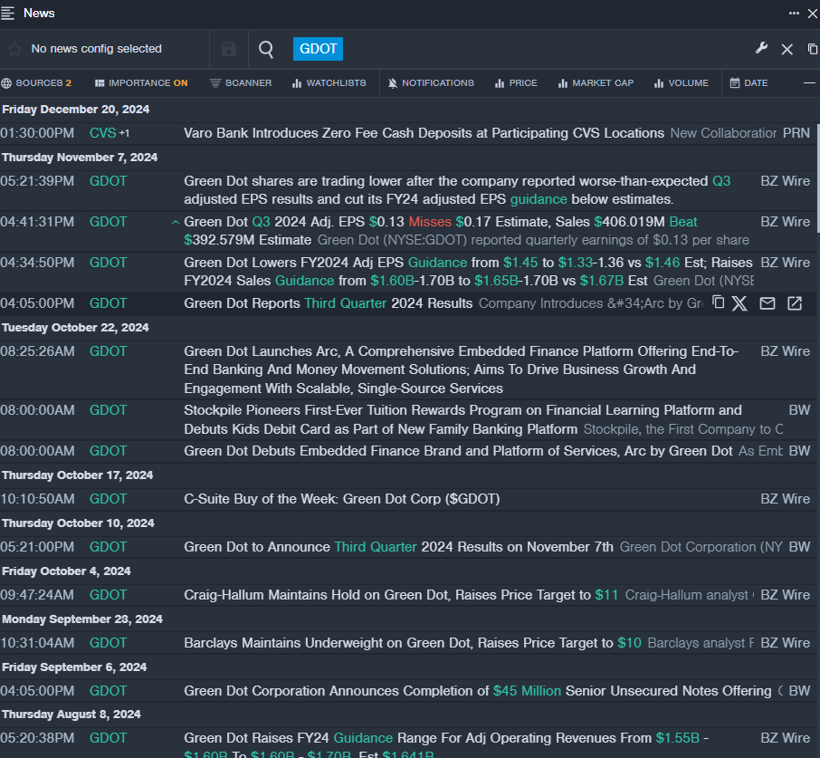 - On Nov. 7, Green Dot reported worse-than-expected third-quarter adjusted EPS results and cut its FY24 adjusted EPS guidance below estimates. “It was a solid quarter of execution, and we are excited about the launch of our embedded finance brand, Arc by Green Dot, signifying our commitment to this sizable market where we believe ample opportunity for long-term growth exists,” said George Gresham, Chief Executive Officer of Green Dot. The company’ stock fell around 17% over the past month and has a 52-week low of $7.70.