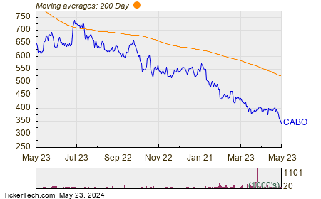 Examining the chart, we observe that CABO’s 52-week trading range spans from a low of $344.345 per share to a high of $749, with the recent trade clocking in at $345.27.