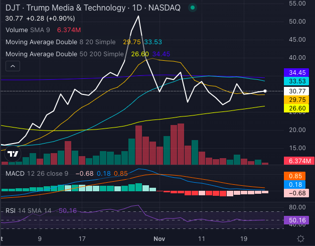DJT stock, at $30.77, sits above its eight-day simple moving average (SMA) of $29.75, offering a short-term bullish signal.
