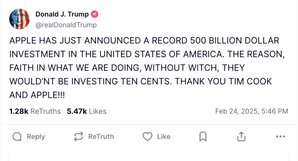 President Donald Trump took to social media to praise Apple Inc. AAPL for its record $500 billion investment in the U.S.