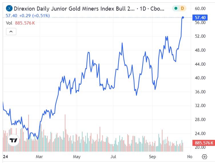 The JNUG ETF: Thanks to strong sentiment for gold, the JNUG ETF unsurprisingly has been strong this year, gaining over 75%.