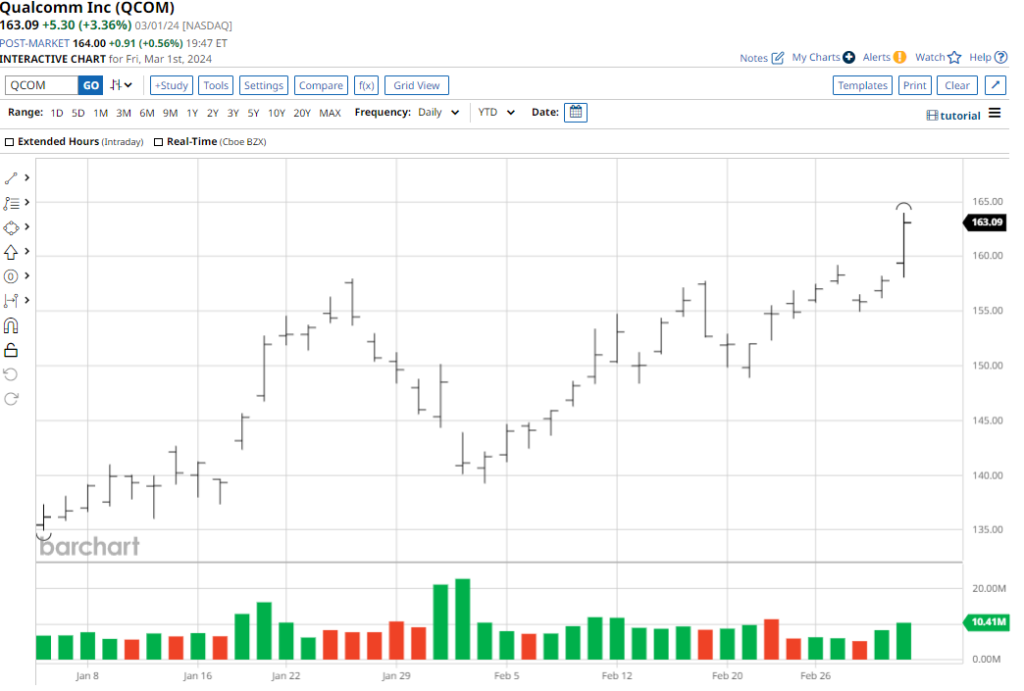 Established in 1985 and headquartered in San Diego, Qualcomm Inc (QCOM) specializes in designing and licensing semiconductor chips for mobile and wireless communication devices. The company, valued at a staggering $182 billion, has seen its stock surge by 15% year-to-date, outpacing the tech-heavy Nasdaq-100 Index’s 10.5% rise.