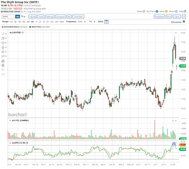 The Shyft Group (SHYF), a specialty vehicle manufacturer valued at $525 million by market cap, is making waves in the stock market. Having lagged behind in recent years, SHYF catapulted in July, boasting a remarkable 41% increase. However, the stock saw a sharp decline in August, plummeting 18% from its peak amidst resurging recession concerns.
