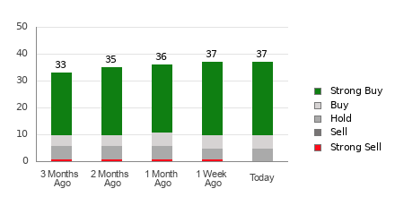 Micron currently has an average brokerage recommendation (ABR) of 1.41, on a scale of 1 to 5 (Strong Buy to Strong Sell), calculated based on the actual recommendations (Buy, Hold, Sell, etc.) made by 37 brokerage firms. An ABR of 1.41 approximates between Strong Buy and Buy.