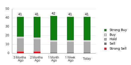Netflix currently has an average brokerage recommendation (ABR) of 1.70, on a scale of 1 to 5 (Strong Buy to Strong Sell), calculated based on the actual recommendations (Buy, Hold, Sell, etc.) made by 41 brokerage firms. An ABR of 1.70 approximates between Strong Buy and Buy.
