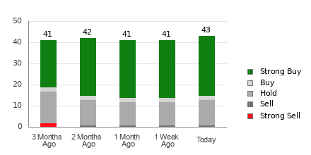 Netflix currently has an average brokerage recommendation (ABR) of 1.66, on a scale of 1 to 5 (Strong Buy to Strong Sell), calculated based on the actual recommendations (Buy, Hold, Sell, etc.) made by 43 brokerage firms. An ABR of 1.66 approximates between Strong Buy and Buy.
