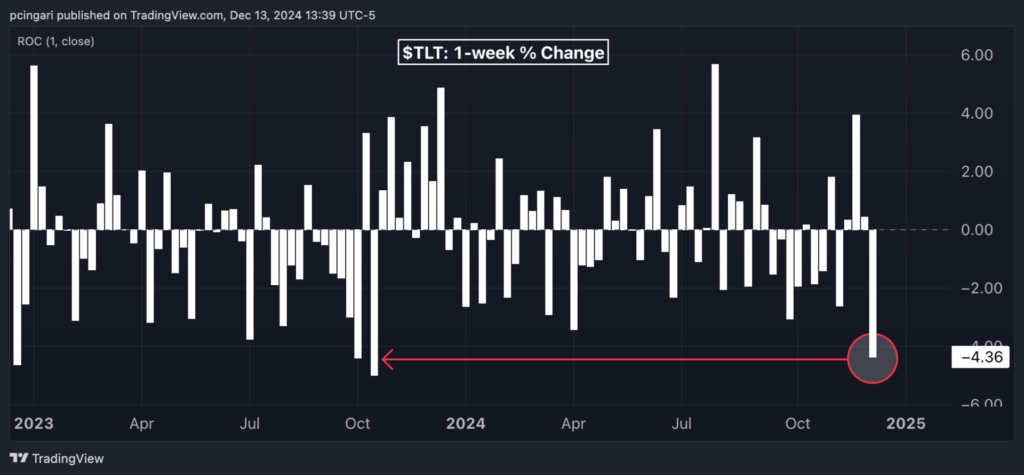 The iShares 20+ Year Treasury Bond ETF TLT dropped 0.9%, hitting a three-week low and marking its fifth consecutive daily decline. For the week, the TLT ETF has lost over 4%, on track for its worst performance since mid-October 2023.