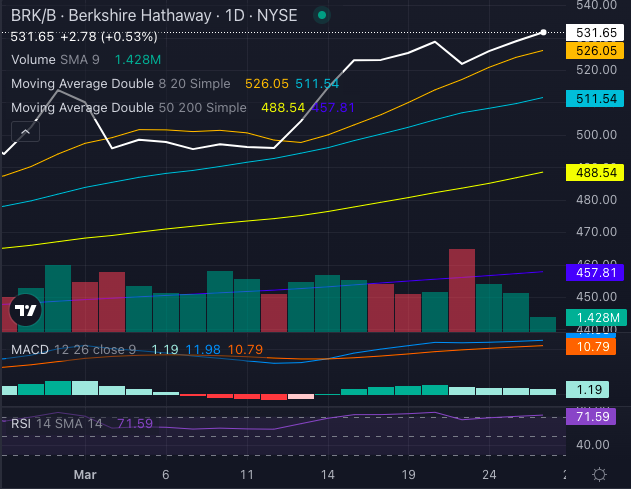 However, there’s a small red flag—Berkshire’s Relative Strength Index (RSI) of 71.59 signals overbought conditions, hinting at potential near-term cooling. For now, though, the trend is undeniably bullish, and BRK.B stock remains a market darling.