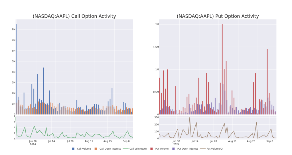 A peek into the volume and open interest provides pivotal insights for stock aficionados. This treasure trove of information proves instrumental in deciphering the liquidity levels and interest rates surrounding Apple’s options, particularly within a strike price spectrum ranging from $165.0 to $240.0 over the previous month.