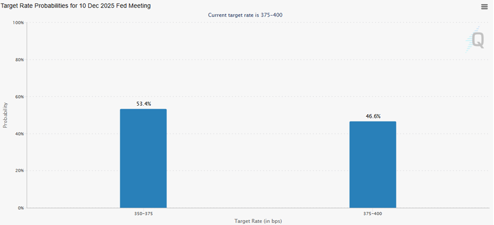 As you can see below, the CME Group’s FedWatch Tool puts 53% odds on a quarter-point cut with a 47% likelihood that the Fed holds rates steady.