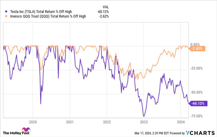 As the stock market veers on an upward trajectory, the spotlight has shifted away from the once-dominant Tesla. Despite the market’s robust performance, Tesla’s shares have taken a tumble, plummeting 34% year to date. The stark contrast between Tesla’s downturn and the Nasdaq-100’s ascent paints a vivid picture of the current landscape.