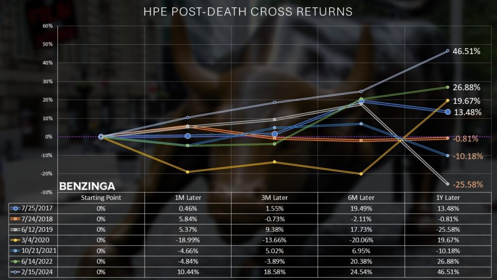 Adding to the downbeat assessment, Benzinga’s options scanner identified net bearish activity in HPE stock on the same day that the Death Cross flashed. While every market participant effectively has an opinion, some opinions are frankly more important than others. When the whales position themselves in a particular way, it’s always worth paying attention to.