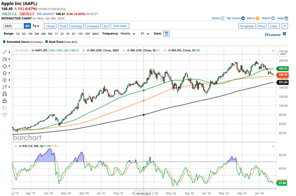 Apple (AAPL) stock has seen a rollercoaster ride in recent years, being the top-performing FAANG stock in both 2019 and 2020. As of 2022, it regained its crown amidst a market turmoil where its peers tumbled. However, Apple’s fortunes took a downturn in 2023, trailing behind other FAANG giants and turning red in the current year, with its stock hitting lows not seen since October and nearing its 52-week minimum.