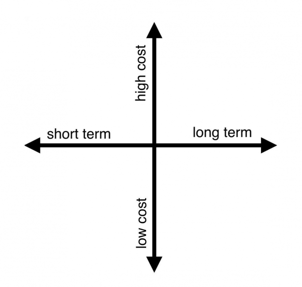 You can also arrange your board by time and cost. Grab your board (or open your digital file) and draw a simple grid with four quadrants. Your horizontal line represents time (short term to long term), and your vertical line represents cost (low cost to high cost).
