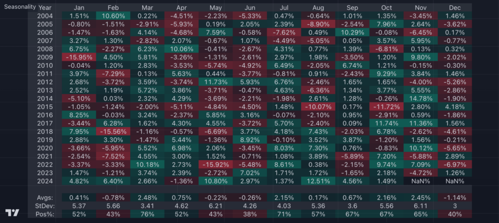 When extending the timeframe to 30 years, the data remains consistent: December is still Walmart’s worst-performing month, with shares dropping 0.9% on average and maintaining a winning ratio of just 40%.