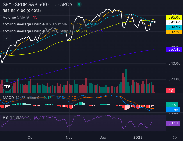 • Longer-term caution: SPY is trading below its 50-day moving average of $595.08, hinting at potential weakness.