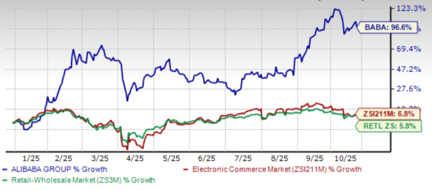 BABA shares have surged 96.6% in the year-to-date period, outperforming the Zacks Internet – Commerce industry and the Zacks Retail-Wholesale sector’s growth of 6.8% and 5.8%, respectively.