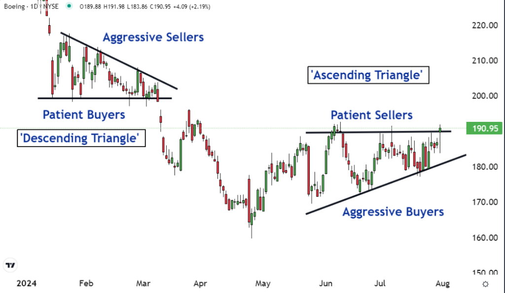 Market patterns like ascending and descending triangles often serve as valuable indicators for traders and investors. The current ascending triangle pattern observed in Boeing’s chart hints at a probable uptrend on the horizon, influenced by aggressive buyer actions and patient seller strategies.